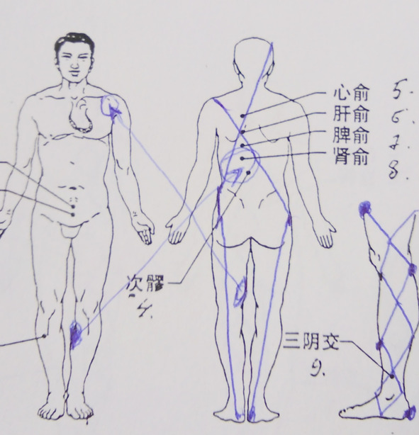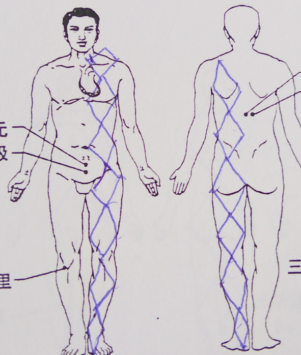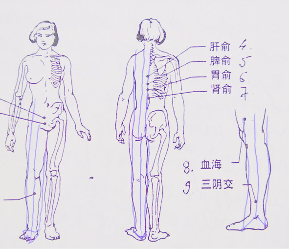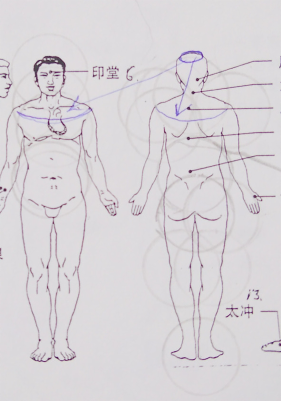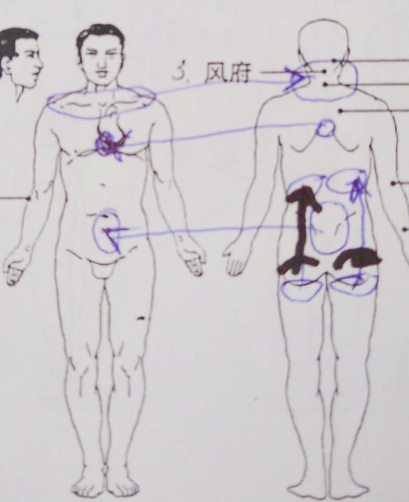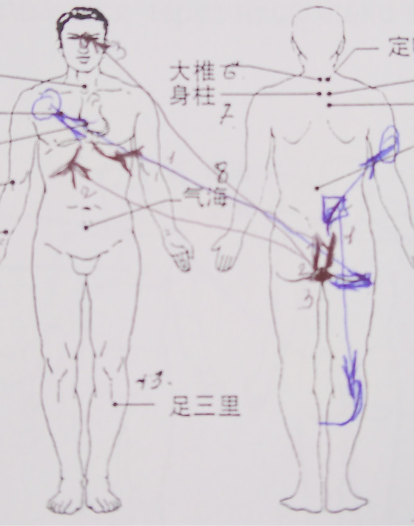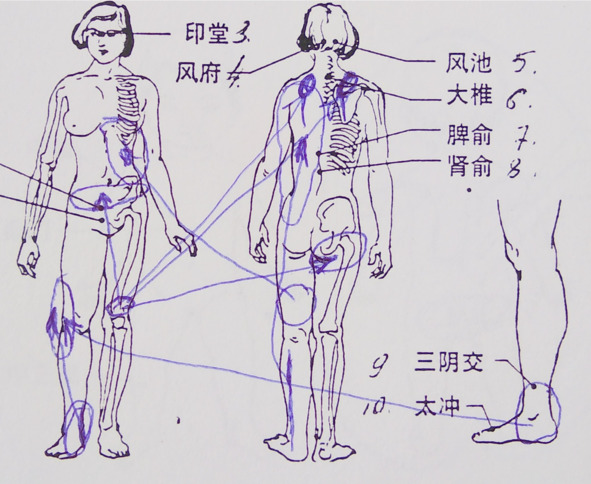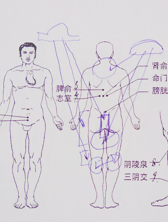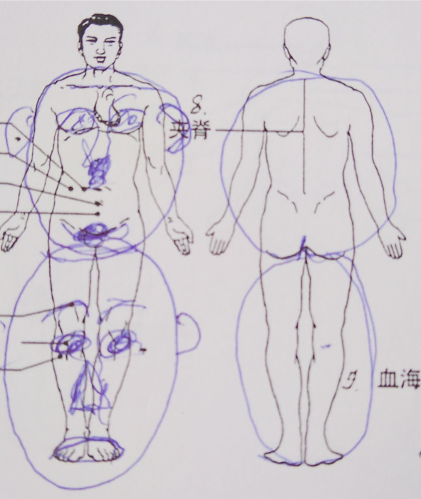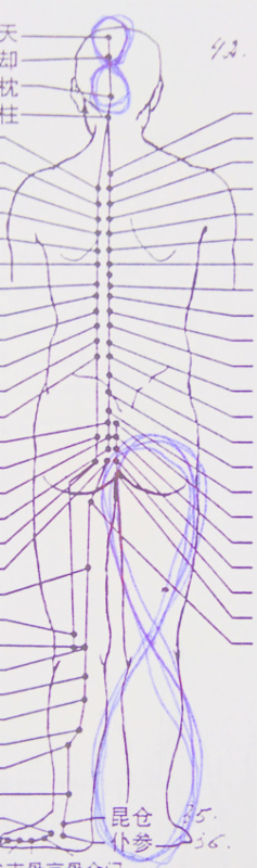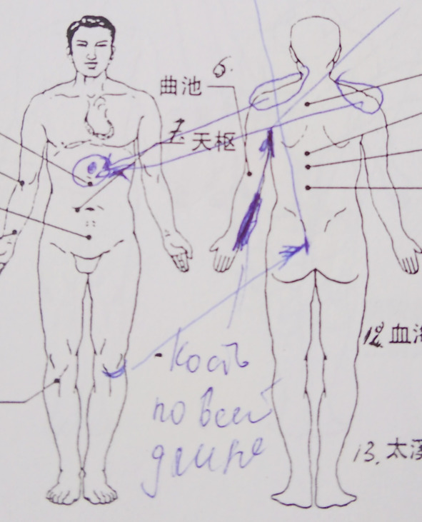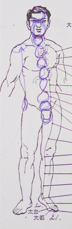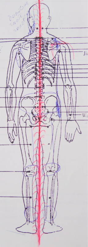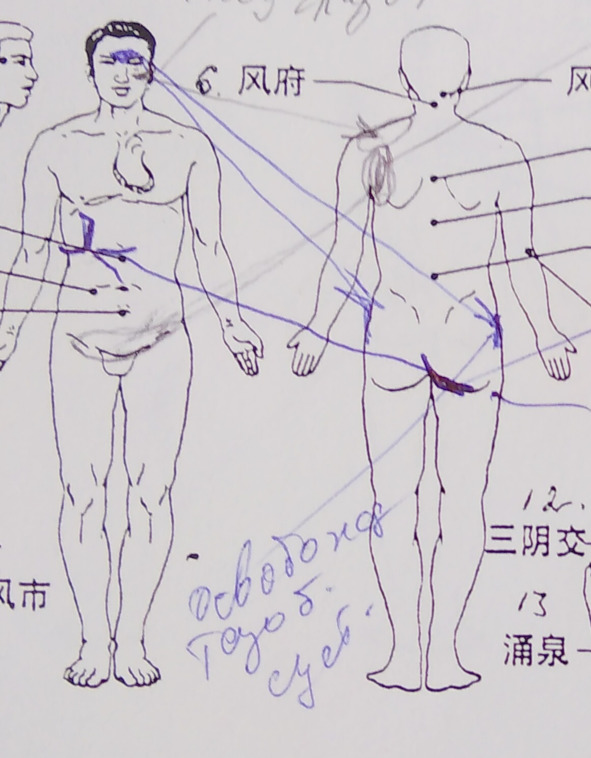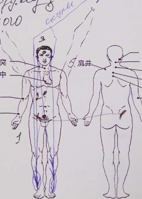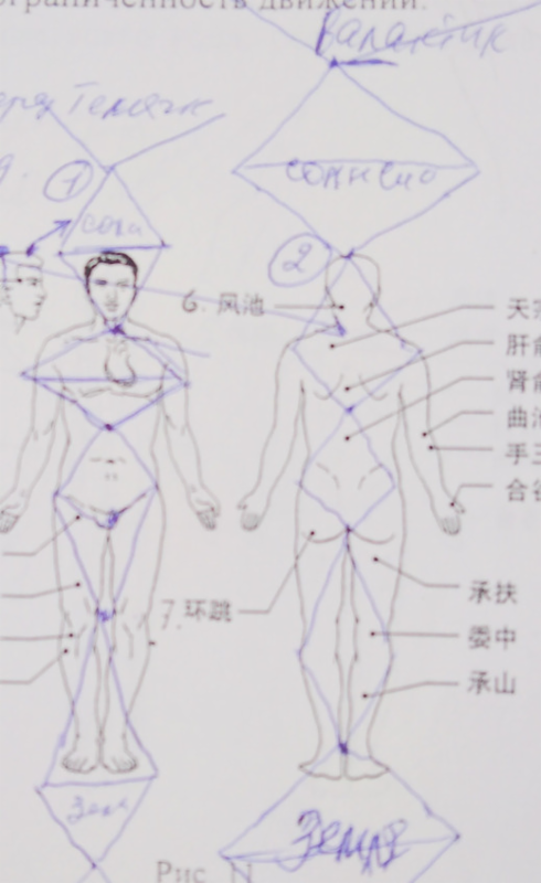 Устраняя спазмы суставов позвоночника, улучшается подвижность ног. Круглые обозначение центров, места дя воздействия прибором Оберег.