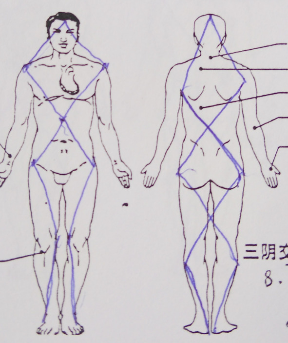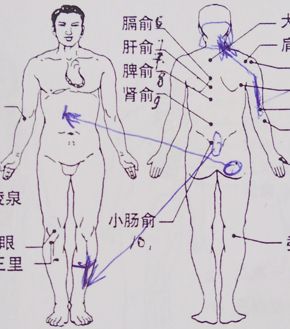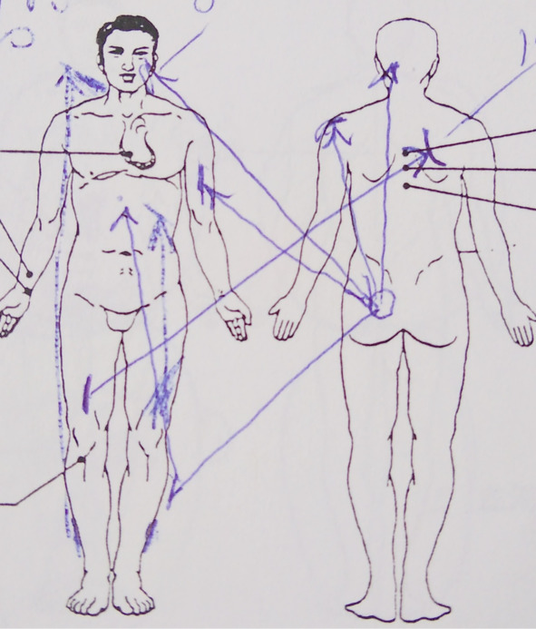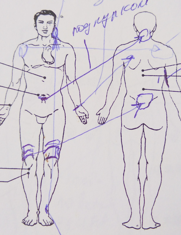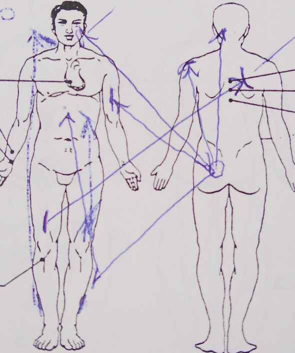 Где пересечение линий, там есть у каждого человека спазм. Как показано, он непосредственно влияет на ухо, плечо, голову.