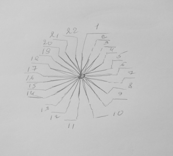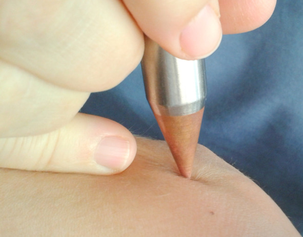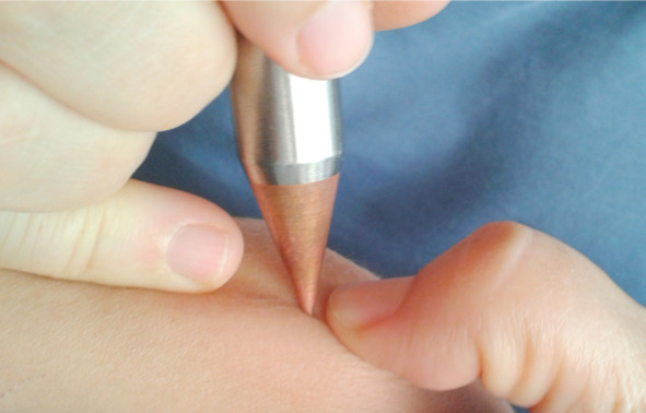 Найдя уплотнение, самостоятельно, или по схеме, что ниже, прижать пальцем до ощущения лёгкой боли, определив центр уплотнительного кольца, можно накладывать острием, прибор Обериг.