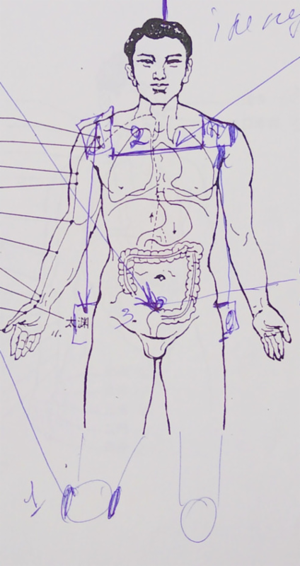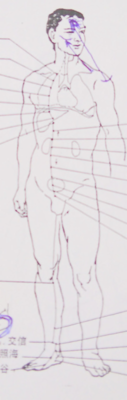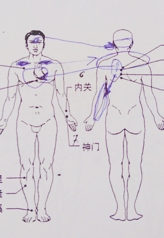 Морщинка на лбу возле носа, спазм, создает нарушение диафрагмы и в солнечном сплетении. В итоге проблемы возникают там, где стрелочки.