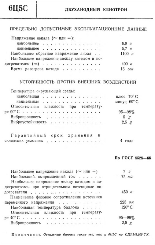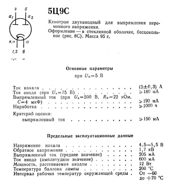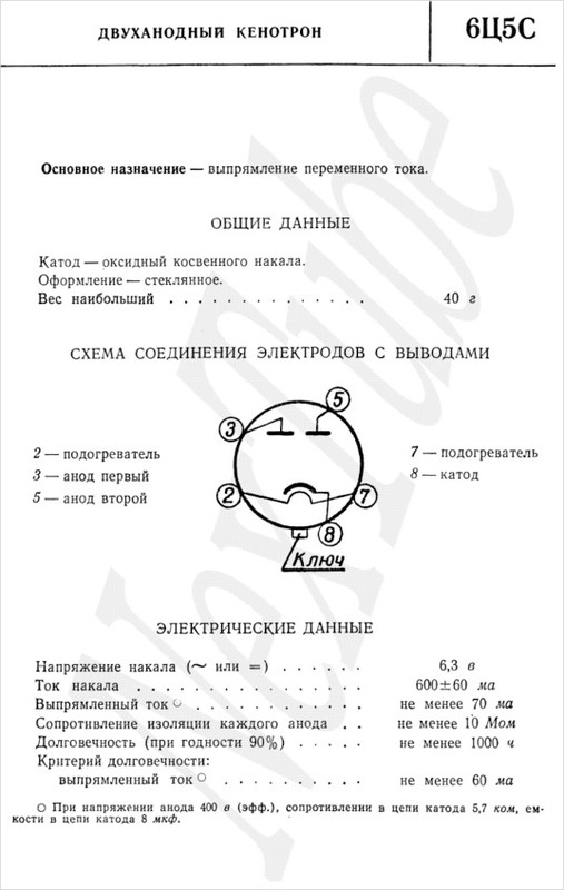 6Ц5С — двуханодный кенотрон косвенного накала. Напряжение накала 6.3 В. Лампа имеет октальный восьмиштырьковый цоколь. А значит, занимает больше места. Но зато смотрится солиднее, эдакий пузанчик. Иногда внешний вид является значимым фактором. Имеются импортные аналоги 6Х5GT, EZ90. 6Ц5С- двуханодный кенотрон косвенного накала. Напряжение накала 6.3 В. Лампа имеет октальный восьмиштырьковый цоколь.