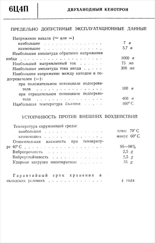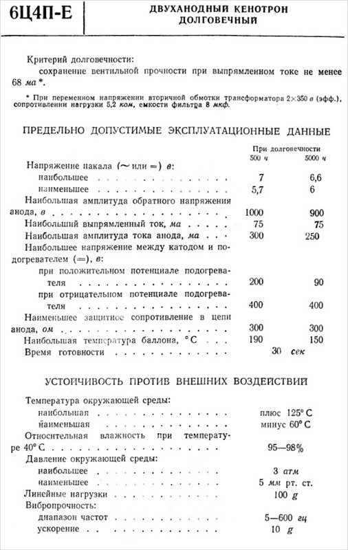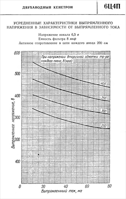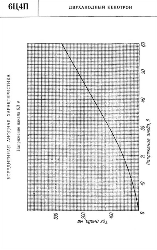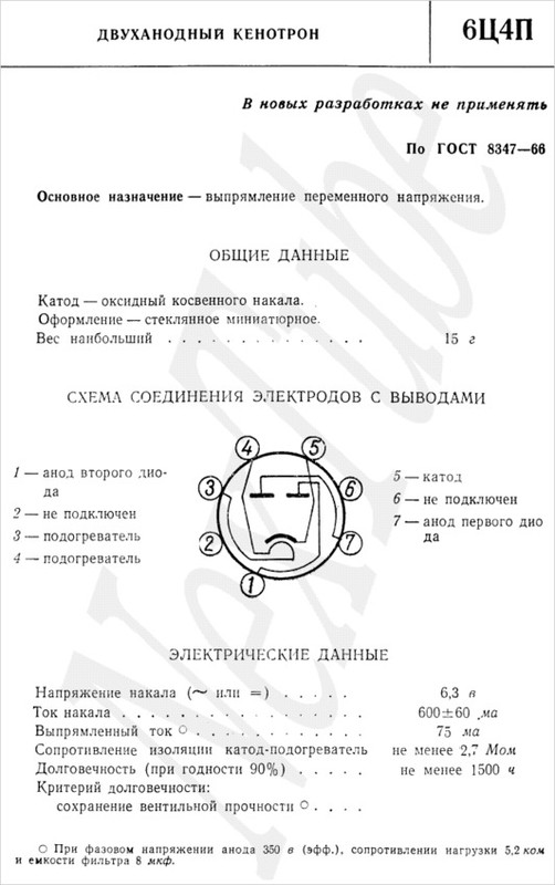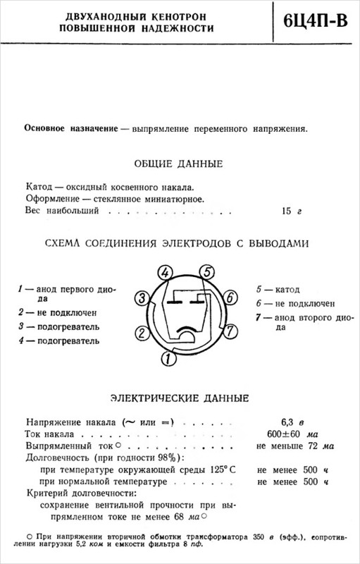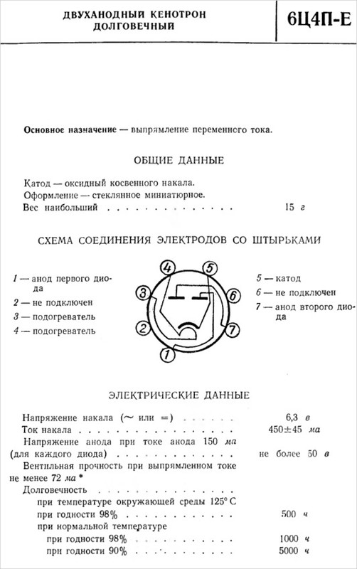 6Ц4П — двуханодный кенотрон косвенного накала. Напряжение накала 6.3 В. Лампа пальчиковая семиштырьковая. Существует разновидность этого кенотрона с буквой Е (повышенной надежности). Так вот, при выборе, какой кенотрон использовать 6Ц4П, 6Ц5С или 6Ц4П-Е, предпочтение следует отдать последнему по двум причинам: