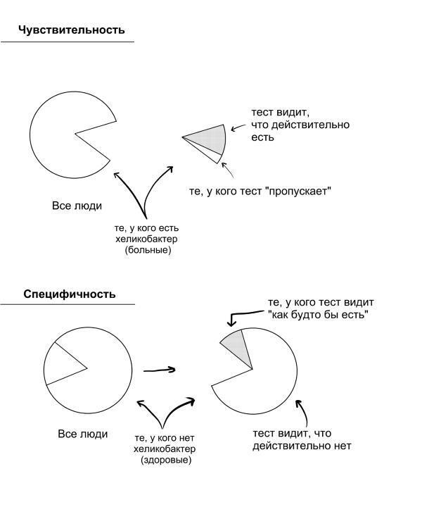 Часто для быстрого обследования большого количества пациентов используют аммиачный дыхательный тест. Он имеет достаточно высокую чувствительность, но низкую специфичность. Что это значит? Немного сложно, но важно, поэтому надо перечитать несколько раз определения ниже и осознать их смысл, поскольку он отражает философию медицины.