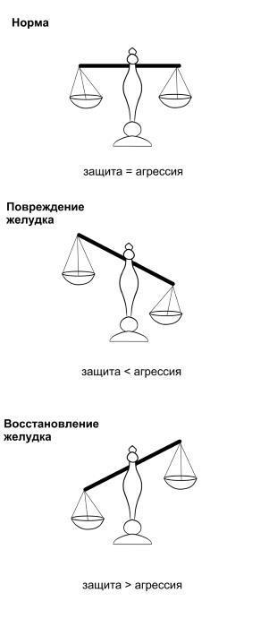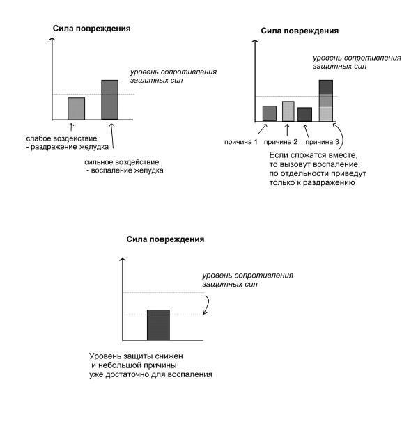 Для развития хронического гастрита должны сойтись два условия: с одной стороны, повреждающие причины должны быть достаточной силы и продолжительности, чтобы вызывать воспаление. С другой стороны, защитные силы организма должны быть достаточно слабыми, чтобы не защитить слизистую оболочку желудка. Чем сильнее повреждение и чем слабее защита, тем с большей вероятностью возникнет воспалительный процесс и тем тяжелее последствия.
