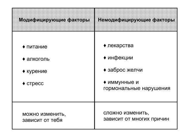 Первые четыре причины – питание, алкоголь, курение и стресс. Следующие четыре причины, которые не зависят или не полностью зависят от человека: лекарственные препараты, вирусные и бактериальные инфекции, забрасываемая из двенадцатиперстной кишки желчь и иммунные нарушения.