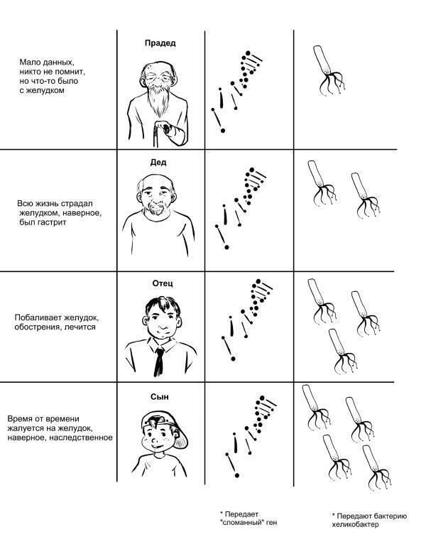 В то же время не стоит преувеличивать роль генетики – это далеко не основная причина гастрита. Хотя заболевание часто обнаруживается сразу у нескольких членов семьи, причиной могут быть не гены, а всего лишь распространение хеликобактерной инфекции внутри семьи. Этот микроб передается через слюну, посуду и немытые руки. Раньше считалось, что если болезнь есть у всех членов семьи, то это и подтверждает роль наследственности. Когда научились расшифровывать гены, открыли хеликобактер и научились ее правильно проверять, оказалось, что в подавляющем большинстве семей причиной гастрита была не наследственность, а внутрисемейное распространение хеликобактер. В итоге влияние наследственной предрасположенности оказалось сильно преувеличено, но многие до сих пор оправдывают этим наличие у себя проблемы, и это мешает им вылечиться.