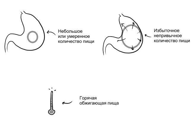 Продукты питания влияют на желудок за счет физических факторов. Имеет значение количество, консистенция и температура.