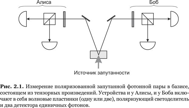 Наверное, каждый прилежный студент-физик в этот момент первым делом спросит, был ли данный вывод проверен экспериментально. Ответ положительный. Чтобы провести этот эксперимент, исследователь многократно подготавливает состояние |Ψ–⟩ и проводит измерение Алисы, все время в одном и том же базисе. Каждый раз, когда Алиса обнаруживает, скажем, |θ⟩, экспериментатор измеряет поляризацию фотона Боба. По статистике этих измерений он может восстановить искомое состояние при помощи квантовой томографии (см. упр. 1.15) со сколь угодно высокой точностью.