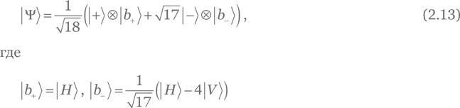 Поскольку векторы |+⟩ и |–⟩ ортогональны, ортогональны также |+⟩ ⊗ |b+⟩ и |–⟩ ⊗ |b–⟩ в соответствии с уравнением (2.4). Это означает, что мы можем построить в 핍A ⊗ 핍B ортонормальный базис, содержащий упомянутые состояния в качестве элементов. Если мы измерим |Ψ⟩ в этом базисе, то получим |+⟩ ⊗ |b+⟩ с вероятностью