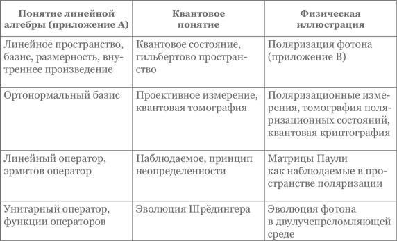 Книга содержит материал, который можно преподать студентам в рамках двухсеместрового курса квантовой механики. В главе 1 вводятся главные принципы и постулаты КМ, которые иллюстрируются кубитом поляризации фотона. Читатель, возможно, захочет изучать эту главу параллельно с приложением A, в котором разобраны основы линейной алгебры, необходимые в КМ, как показано в таблице ниже.