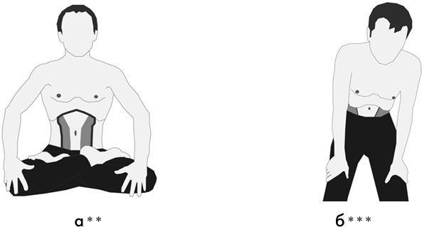 Исходное положение – стоя, ноги прямые, стопы на ширине плеч. Ладони укладываем на таз, пальцами вверх. Прогибаясь в грудном отделе, грудную клетку разворачиваем вверх и толкаем ее к потолку. Во время выталкивания грудной клетки к потолку вытягиваем поясницу. Поясница прогибается, но этот прогиб распределяем равномерно по всему позвоночнику и, таким образом, не перегружаем поясницу. Руками толкаем таз вперед. Прогиб должен напоминать дугу, словно позвоночни