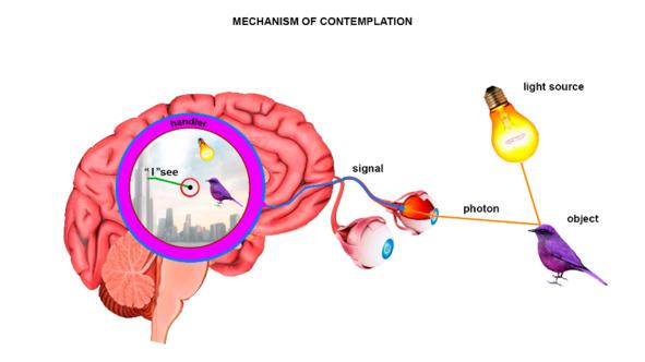 Knowing the structure, this is “nonsense’, although the main problem is precisely that the simplest thing turns out to be extremely difficult to understand, so only methodical repetition and periodic return to this structure will help us, that is, explaining it in other (and different) words, and looking from different positions. Let us take into account that it is not only the handler that turns out to be an obstacle, but there are also other obstacles, for example photons — they act only as a carrier of information, and are not the contemplated object itself (and only for now this is exactly the case); the eye cell receives photons, but sends an electrical signal to the brain processor (handler); we especially note that — the result of processing is not contemplated, in the conscious sense;