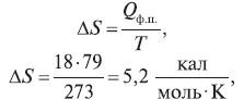 Пример 3. Один моль льда тает при температуре 0 °С. Удельная теплота фазового перехода твердое тело–жидкость составляет 79 кал/г. Рассчитайте энтропию фазового перехода твердое тело–жидкость.