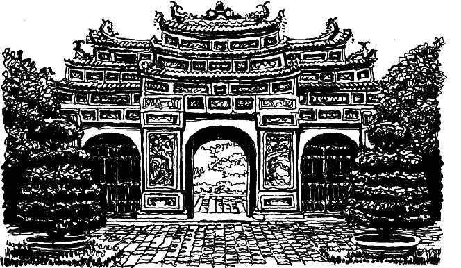 Одной из жемчужин Хюэ являются Полуденные ворота (Нго Мон) – красивый двухэтажный павильон, крыша которого выложена золотой и зелёной черепицей. Помимо Полуденных ворот есть ещё три въезда на территорию Императорского двора: Ворота Мира на севере, Ворота Гуманности на востоке и Ворота Добродетели на западе, но южные Полуденные ворота – самые красивые. Они открывались только во время важных дворцовых церемоний. Пройдя через Нго Мон, вы попадаете во «Дворец Совершенной Гармонии», Тхайхоа, с искусно украшенным тронным залом. К сожалению, Пурпурный город был практически уничтожен в ходе Гражданской войны и американской интервенции. Дай Ной состоит из шести кварталов, разделённых высокими стенами: это судебный квартал, храмовый, квартал королевы-матери, квартал, где обитала придворная аристократия, квартал королевских ремесленников (здесь располагалась и императорская сокровищница). Шестой квартал был занят Пурпурным Запретным городом, теперь же здесь в основном, сады и огороды.