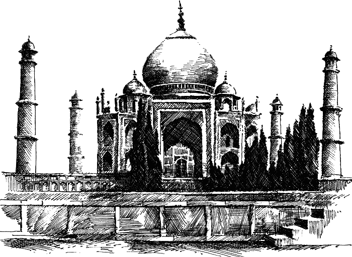 Главным архитектором был назначен талантливый строитель Усад Иса Кхан из Шираза. Он получил от императора право требовать для строительства любые деньги, материалы, драгоценности, любое количество мастеров и рабочих. По преданию, Усад Иса Кхану помогали архитекторы из Европы, венецианец и француз, но имена их до нас не дошли. Строительство Тадж-Махала продолжалось двадцать два года и работало на нём более двадцати тысяч человек. Результатом стало одно из прекраснейших творений рук человеческих. Вообще-то Тадж-Махал – это не только знаменитый на весь мир мавзолей, но целый комплекс из каналов, зданий, водоёмов, занимающий более 18 гектаров. Археологи установили, что кирпич для строительства изготовляли и обжигали на месте. Мрамор возили из раджпутанских каменоломен за триста километров. Песчаник – из Сикри, полудрагоценные камни – чуть ли не со всей Азии. Во время сооружения огромного купола, (высотой – более 75 метров), была построена покатая насыпь длиной четыре километра, по ней проще было поднимать наверх строительные материалы. Ширина фасада приблизительно равна общей высоте мавзолея, что вместе с большими полукруглыми нишами создает знаменитую «воздушность» Тадж-Махала. Стены мавзолея выложены белым полированным мрамором, который буквально ослепляет в лучах яркого индийского солнца. По углам вознеслись четыре высоких минарета. Поражает Тадж-Махал и своей изощрённой отделкой. Суры Корана, выложенные на стенах изящной вязью из черного мрамора, ажурные решетки, изумительная резьба по камню… Правда, нет уже серебряных дверей с затейливым рисунком из серебряных гвоздиков, нет золотого парапета, изрядно уменьшилось количество драгоценных камней на фасаде.