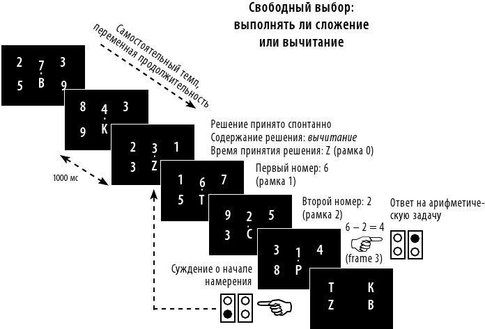 Оказалось, что свободный выбор – решать ту или эту задачу – возникает примерно за 4 (целых четыре!) секунды до того, как испытуемый его осознает, то есть до того, как у него образуется идея «Я сделал такой-то выбор». Это обоснованное и достоверное заключение, поскольку связывание текущего кадра с принятием решения было натренировано испытуемыми, отслежено аппаратурой и производилось за доли секунды, а точность предсказания составила более 70 %. Этот показатель соответствует максимально возможной точности, даваемой аппаратом динамического сканирования мозга в заданных условиях, а оставшиеся 30 %, по всей видимости, относятся не к случаям, когда решение принимается внутри сознания, а к погрешности аппаратуры.
