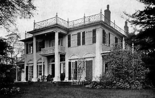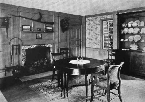 to be the site of the old slave quarters, long since demolished. The walls show several adornments, among the most interesting being the enormous antlers of an elk, which, tradition tells, were presented to the builder of the dwelling by some of the Indians with whom he traded, as an evidence of their friendship and good will. The latter hall is of similar type, entered through a narrow door space and continuing the width of the dwelling; it ends at the rear in a quaint old door that shows above its broad wooden panels a row of green bull's eyes, specimens of early American glass manufacture, still rough on the inside where detached from the molding bar. This door gives upon an old-time garden plot, fragrant with the blooms of its original planting, and preserving intact its early features. Rare bits of old furniture are used in the equipment of this hall, and the paneled walls are hung with family portraits.