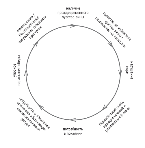 В поведении аддиктов и созависимых участвует цикл вина/зависимость. Он включает в себя: изначальное чувство вины – потребление ПАВ для его подавления и готовности нарушить нормы – нарушение норм – смесь рациональной и иррациональной вины – потребность в раскаянии – воздержание и наказание себя как искупительный ритуал – нарастание обиды – полуосознанное побуждение нарушить нормы (рис. 3).