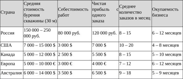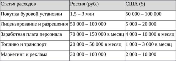 В России средняя стоимость бурения одной скважины глубиной 30 метров составляет 150–250 тысяч рублей, в зависимости от региона и типа грунта. В США аналогичные работы обходятся клиентам в сумму от 3 000 до 15 000 долларов США, что делает буровой бизнес крайне рентабельным.