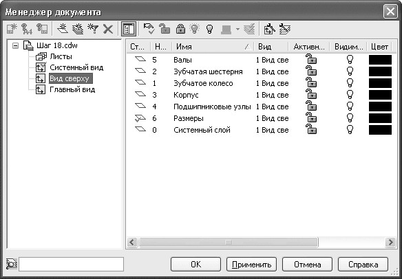 Команда Менеджер документа вызывает на экран одноименное диалоговое окно (рис. 1.29). В этом окне отображается структура графического документа: листы, виды и слои, присутствующие в чертеже. Менеджер документа обладает собственной панелью инструментов, которая позволяет создавать или удалять листы или слои, выбирать текущий вид или слой, изменять свойства объектов, составляющих структуру документа.