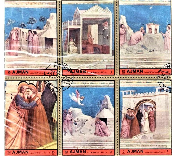 На левай сьцяне капэлы дэль Арэна (Скравеньі) у Падуі намаляваная ў шасьці сцэнах гісторыя Марыі, якая працягвае гісторыю Ёакіма і Ганны — бацькоў Марыі. Першыя дзьве фрэскі гэта: 1. Нараджэньне Марыі. 2. Уводзіны Марыі ў Храм. Яны на марках пошты Арабскага Эмірату (1972 г.)