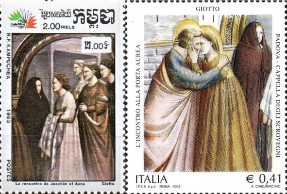 Магчыма таму на марцы пошты Кампучыі з 1985 года паказаны толькі гэты фрагмент фрэскі, на якім адсутнічаюць Ганна і Ёакім, а бачым толькі сьведкаў гэтай сустрэчы. Яе дапаўняе марка пошты Італіі (2003 г.), на якой паказаная хвіліна сустрэчы Ёакіма і Ганны і жанчына ў чорным. Выданьне прасьвечана 700-сотай гадавіне асьвячэньня царквы Сьвятой Марыі Міласэрднай у 1303 годзе папам Рымскім