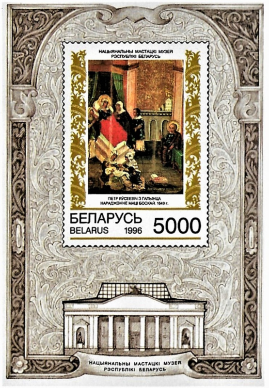 Багародзіца ў тысячу разоў часьцей сустракаецца на карцінах, чым у Біблейскіх тэкстах. Але марак, прысьвечаных нараджэньню Марыі, адзінкі. Таму вельмі прыемна, што ў 1996 годзе пошта Рэспублікі Беларусь выпусьціла Блёк з маркай, на якой разьмешчаны відарыс іконы, намаляванай Пятром Яўсеевічам з Галынца ў 1649 годзе «Нараджэньне Маці Боскай». Ікона зьберагаецца ў Нацыянальным мастацкім музэі Беларусі