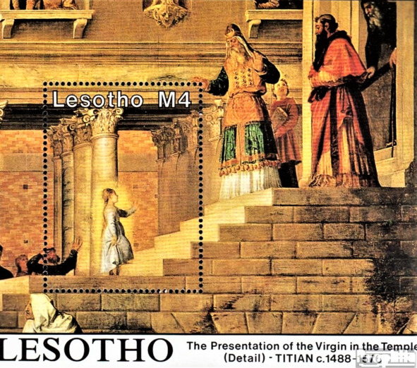 «Увядзеньне Багародзіцы ў храм» рэпрадукцыю карціны Філіпа Ліпі на блёку пошты Лесота (1988 г.)