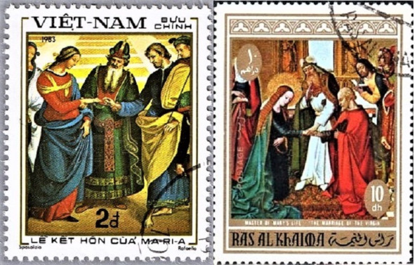 «Заручыны Марыі» Рафаэля Санці на марцы Віетнаму (1983 г.). «Заручыны Богамаці». Майстар жыцьцярысу Багародзіцы (Meister Des Marienlebens, 17 ст.). Марка Эмірату Рас — эль — Хайма.
