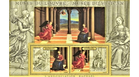 Рэпрадукцыя карціны «Дабравесьце» з раньніх работ Рафаэля Санці на блёку сумеснага выпуску пошты Францыі і пошты Ватыкану, надрукаваным у 2005 годзе