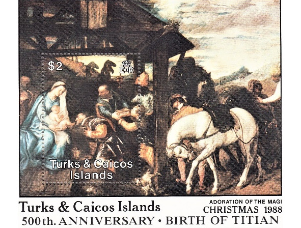 Выява карціны Тыцыяна «Пакланеньне мудрацоў» на блёку пошты Тэркс і Кайкос (Turks and Caicos Islands), 1988 г