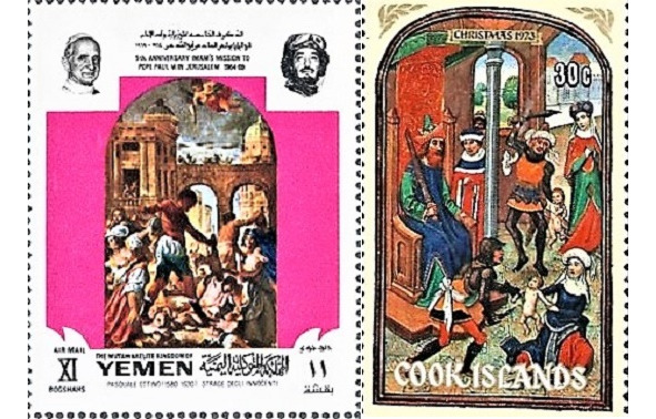 Пошта Емену на марцы (1969 г.) паказала рэпрадукцыю карціны мастака Паскуале Аціна, на якой салдаты Ірада забіваюць немаўлят. Забіцьцё немаўлят — тэма маркі Выспаў Кука, выдадзеная ў 1973 г. (Мініяцюра Люксэмбургскага часаслова 15 в.)