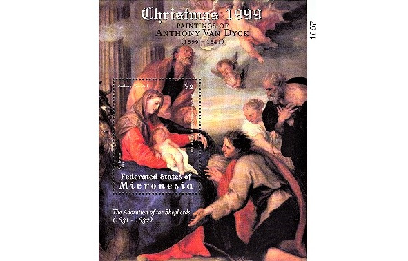 Палюбуемся блёкам пошты Мікранэзіі (1996 г.) з выявай карціны Антоніса Ван Дэйка. Арыгінал карціны «Пакланеньне пастухоў» знаходзіцца ў царкве Прасьвятой Багародзіцы ў Дэдэрмундзе (Бэльгія). Незвычайна, што адзін з пастухоў жанчына