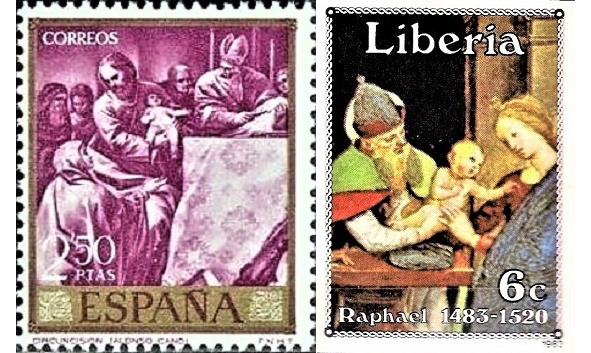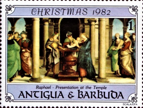У 1982 годзе пошта краіны Антыгуа і Барбуда надрукавала на марцы рэпрадукцыю карціны Рафаэля «Ахвяраваньне ў храм»