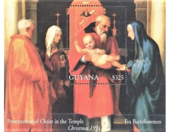 «Ахвяраваньне ў храм». Выява карціны Фра Барталамеа (Fra Bartolommeo) на блёку пошты Гаяны (1994 г.)