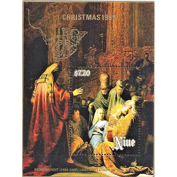 Шчасьлівы дзень Сымона старца. «Ахвяраваньне ў храм» на блёку пошты Ніуэ (1989 г.). Выява карціны Рэмбрандта