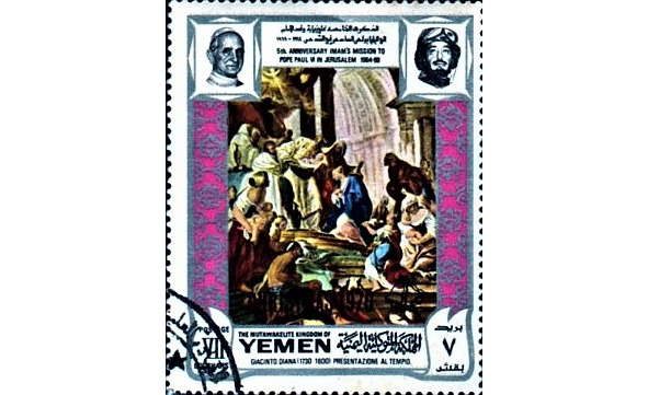 Марка пошты Емэну (1969 г.) з сэрыі, прысьвечанай візыту Папы. Карціна «Ахвяраваньня ў храм» Гіацынта Дыяна (Giacinto Diana (1730—1803)