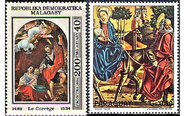 Рэпрадукцыю карціны Карэджа «Адпачынак на шляху ў Егіпет» на марцы Мадагаскару (1984 г.) і «Уцёкі ў Егіпет» на марцы Парагваю (1971 г.) — рэпрадукцыя карціны Міхала Пахера (Michal Рacher)