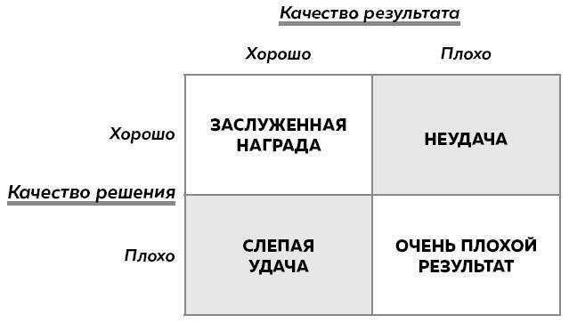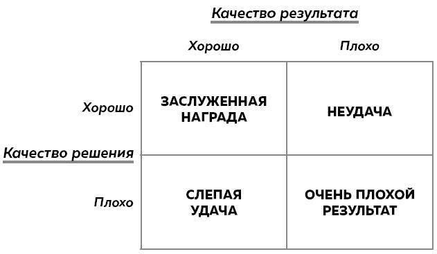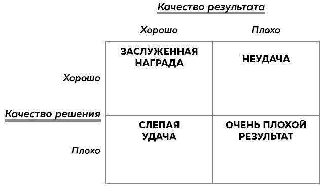 Когда фокус с оценки решения смещается на оценку результата, вы рискуете повторить те решения, которые благодаря удаче привели к хорошим результатам. Вы также можете не захотеть принять хорошие решения, которые из-за неудачи не дали выхлопа.