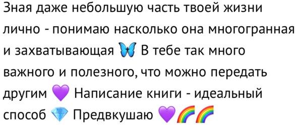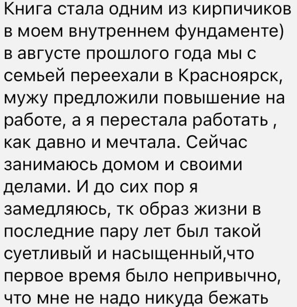Я хочу, чтобы во время неспешного вдумчивого чтения ты могла по-настоящему прочувствовать каждую главу. Прожить со мной все истории, а в некоторых даже узнать себя и найти отклик внутри. Пусть чтение оставляет приятное послевкусие и инсайты на «подумать» после каждой главы: «Что задела во мне эта тема? Хотела бы я в неё углубиться? Какое состояние во мне включилось сейчас? Была ли у меня похожая ситуация?». Эти вопросы помогут распаковать смысл ещё глубже и получить больше ценности.