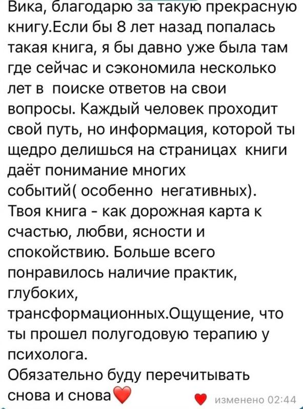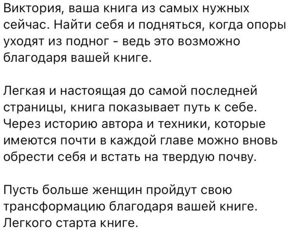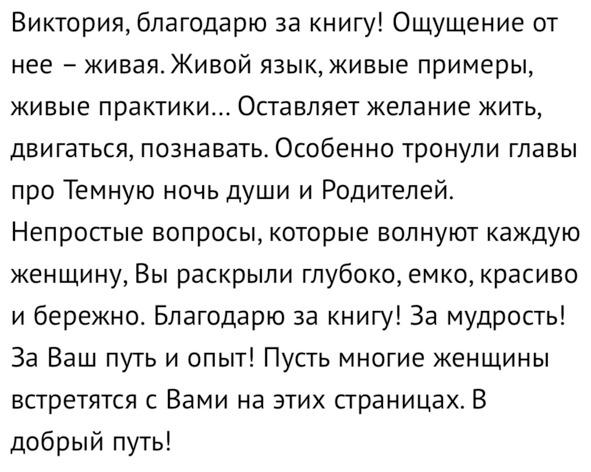 Я хочу, чтобы после совместного многоступенчатого пути, в конце книги каждая обрела то, что ищет. Не список умных теорий и крутых техник. А именно свой результат. Чтобы ты совершила действия, которые принесут новый опыт. Переживания, совершенно отличные от прежних, иные смыслы. Чтобы в конце книги ты почувствовала трансформацию. Как ощущают её все женщины, кто когда-либо проходили со мной групповую или индивидуальную работу. Могу с уверенность утверждать, что ответственно пройдя все ступени программы — восстановление, наполнение, управление — ты точно не останешься прежней. Конечно, для кого-то книги будет недостаточно и потребуется продолжение работы лично или в группе. Но это уже следующий уровень. И я всегда буду рекомендовать прочитать сначала книгу. И только потом идти дальше. Многие потребности эта книга закроет легко в самостоятельной работе.