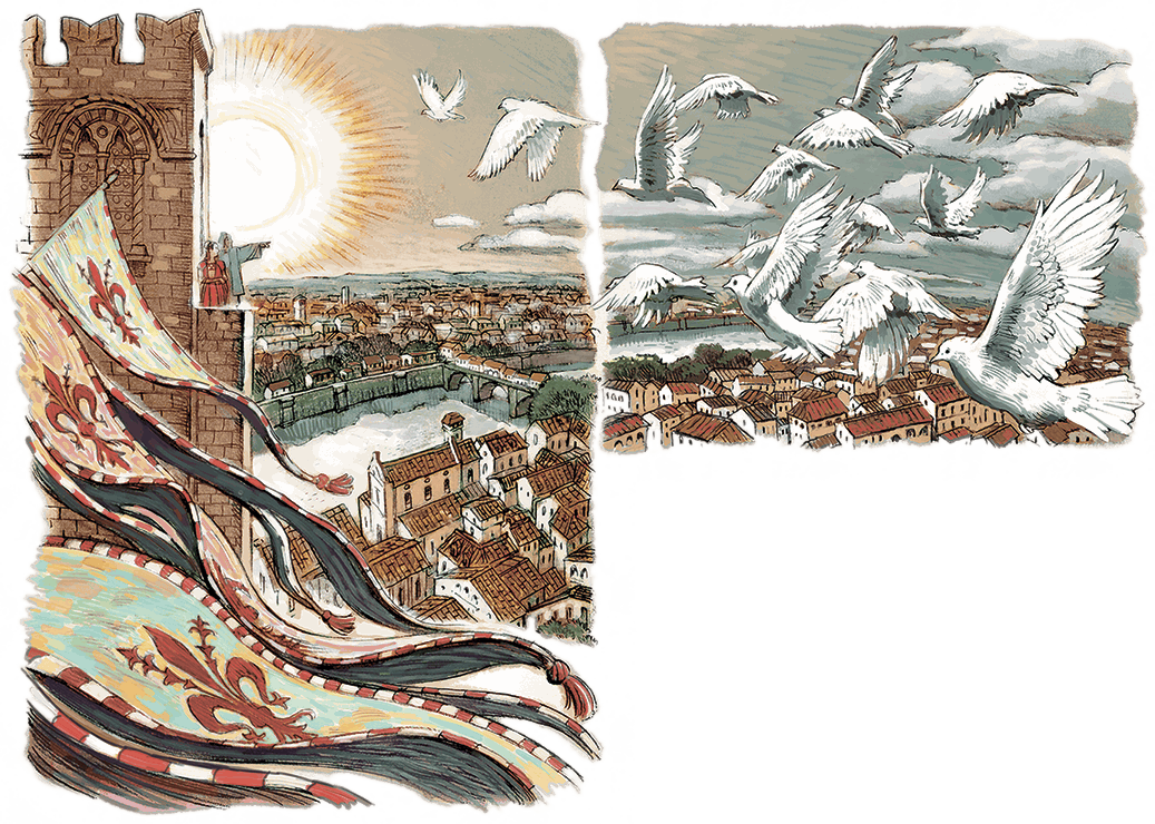 В то время молодая республика Флоренция была ещё не особенно сильна. Население её состояло главным образом из прядильщиков и ткачей, которые больше всего хотели мирно жить и трудиться. В городе было немало даровитых людей, но они не были воинственны и славу для себя видели в том, чтобы установить во Флоренции наилучшие законы и порядок.
