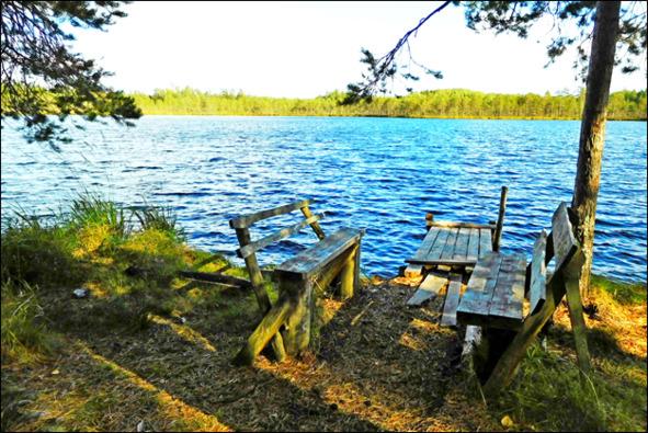 Потом мы заехали на Журавское озеро или Журавку, здесь водится не только окунь, но и щука. Справа от него за соснами виднелось Крюковское озеро, оно же Кривое; это потому, что озеро узкое, но извилистое, как река. Глубокое озеро встретило нас тоже красивым сине-голубым цветом своей воды. Я набрал в ладошки воды и попил, она показалась мне очень вкусной. На берегу озера устроены два стола со скамейками.