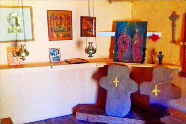 Перед находящейся на центральном месте иконой Параскевы Пятницы в окладе, украшенном виноградной лозой, на подставке лежат свечи. Потолка в часовне нет. Каменного креста в часовне я не обнаружил, он или утрачен при пожаре в годы войны, или лежит под досками пола. Часовня, видимо, когда-то и была поставлена над этим крестом, о котором упоминалось в источнике 1884 г.