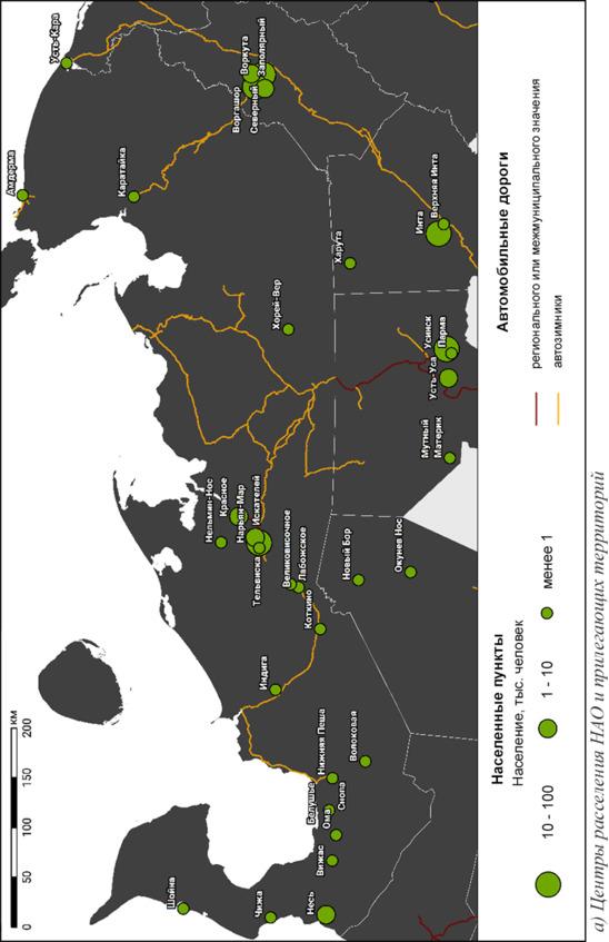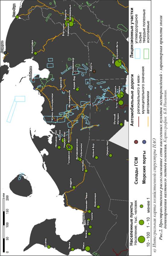 Однако времена были уже рыночные, и вместо городов восточная, нефтегазоносная часть округа покрылась сетью вахтовых поселков. Западная часть — это по большей части старинные русские поселки, по всему округу — поселки национальные (в значительной степени — результат приучения ненцев к оседлости Советской властью), и примерно посередине этих пространств — Нарьян-Мар, отрезанный, по сути, от своей «подвластной» территории и на востоке (откуда проще добраться до Воркуты) и на западе (откуда проще уйти уже на Архангельск) — а сам Нарьян-Мар зимником связан с Усинском и далее Ухтой, «нефтяной столицей Коми», откуда продвигалось нефтяное освоение (рис. 2).
