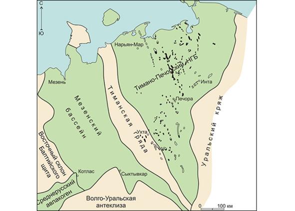 Территория округа прорезана с севера на юг многочисленными реками, впадающими в Северный Ледовитый океан, крупнейшая из которых — Печора, в долине которой сосредоточено почти 80% населения округа, включая столицу — город Нарьян-Мар. Ритм простирания речных долин и разделяющих их возвышенностей с юга на север или с юго-востока на северо-запад задает естественное членение территории на ряд природных областей: Канинская тундра от Мезенской губы до Тиманского кряжа, Малоземельская тундра от Тиманского кряжа до Печоры и Большеземельская тундра от Печоры до Полярного Урала и хребта Пай-Хой. Ритм «тундр» и хребтов вторит геологическому ритму: Канинская, Большеземельская и Малоземельская тундры занимают днища «чаш» (впадин) древнего фундамента — как и логично для днища чаши, эти зоны выстланы мягкими осадочными породами: неудивительно, что именно здесь залегают и залежи нефти и газа (рис. 3).