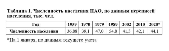Особенность НАО состоит в очень высокой концентрации населения в столице, городе Нарьян-Маре, где проживает более половины (на 1 января 2020 г. — 25,1 тыс. человек, табл. 1); вместе с ближайшим пригородом, поселком Искателей, Нарьян-Мар концентрирует ¾ населения округа.