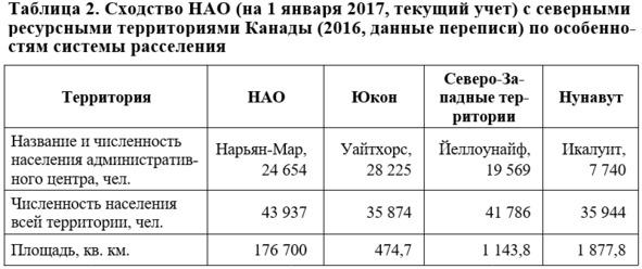 С точки зрения общей численности населения, его низкой плотности и высокой концентрации, округ напоминает северные территории Канады (табл. 2), однако почти не имеет аналогов в России (частичный аналог — Чукотский автономный округ).