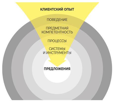 Опыт, получаемый клиентом от нашего предложения, проходит через фильтр восприятия нашего поведения, компетентности, процессов, систем и инструментов. Клиенты воспринимают наши решения лишь через вуали всех этих слоев, обычно начиная с самого внешнего [7].