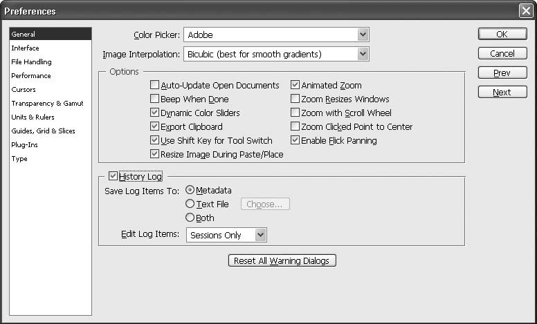 ОкноPreferences (Установки) имеет несколько вариантов. Переключаться между ними можно нажатием кнопокPrev (Предыдущий) иNext (Следующий) или выбирая нужный пункт списка в левой части окна. Установок довольно много, не все из них вам понадобятся. Остановимся только на тех, которые важны для эффективного использования памяти компьютера и обеспечения удобства работы.
